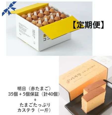 他の画像を見る 冷蔵便 常温便 定期販売 お好きな日程選択可能 たまご農家自慢の2種。両方食べて頂きたい贅沢セット。 【定期便】明日(赤たまご)35個 + 5個保証(計40個)+ たまごたっぷりカステラ(一斤) 1回あたり ¥ 3,895 税込 詳細を見る