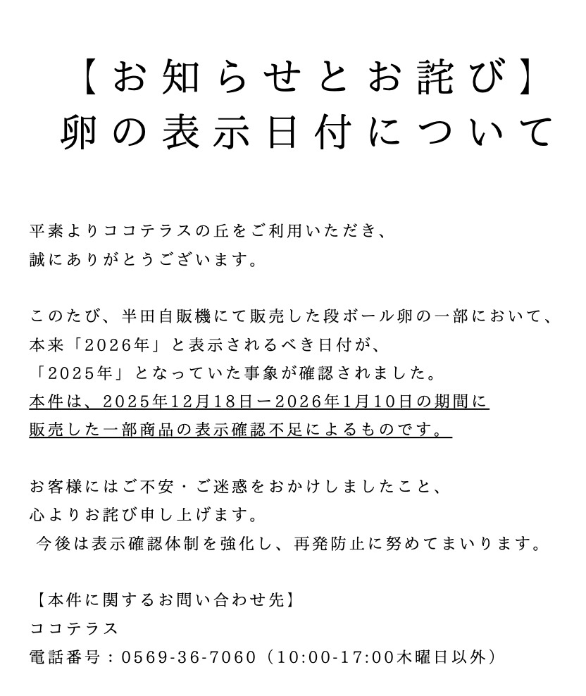 このたび、半田自販機にて販売した段ボール卵の一部において、