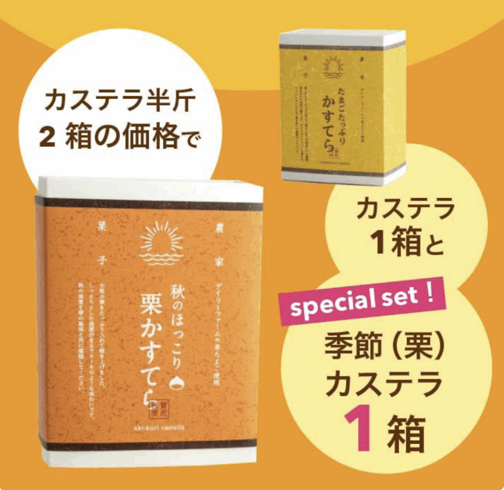 季節限定「栗カステラ」が入った特別セットを販売します。