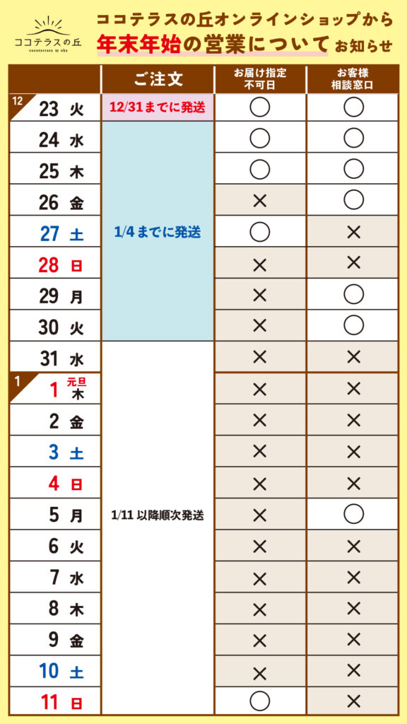 今後ともココテラスの丘オンラインショップをどうぞよろしくお願いいたします。