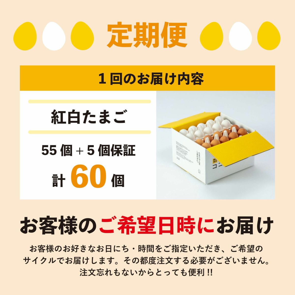 他の画像を見る 常温便 定期販売 お好きな日程選択可能 たまご農家自慢の2種。両方食べて頂きたい贅沢セット。 【定期便】紅白たまご 55個 + 5個保証(計60個) 1回あたり ¥ 2,863 税込 詳細を見る
